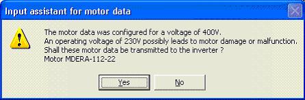 Moreover, before motors which can also be operated at 230 V are loaded a corresponding warning is indicated. The user must acknowledge this warning by pressing the YES or NO button. In addition, the 230 V data is always pre-selected in case of 230 V / 400 V motors.