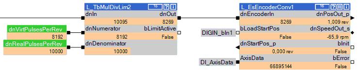- The numerator (L_TbMulDivLim.dnNumerator) must be a power of 2 and must correspond to the value of code C5273 set in the L_EsEncoderConv function block.