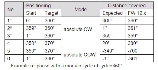 The distance covered during the positioning is too long by one cycle. The target is met correctly, the drive does not show any uncontrolled movement. An approximate following error monitoring cannot detect the behaviour. Positioning to any targets shorter than the modulo cycle can be carried out without any errors.