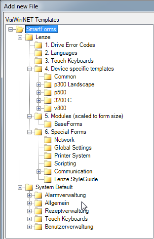 For each Lenze visualization device, the templates for the functions of the recipe management, alarm management, etc. are now made available in relation to the actual display resolution of the device. Thus, the selected templates can be easily added to a new project when they are created. The selection of the device-related templates is based on the Wizard of the device selection.