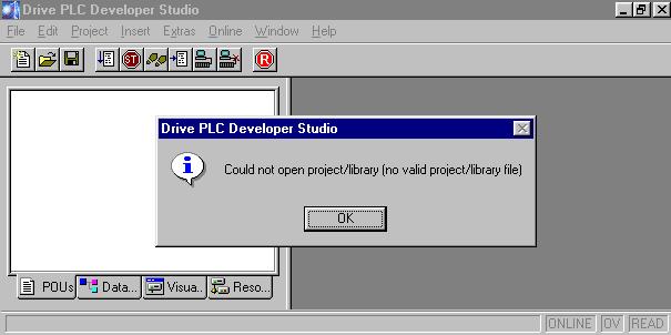 2. When the Drive PLC Developer Studio development environment has been started, the project can be selected and opened via the menu File => Open....