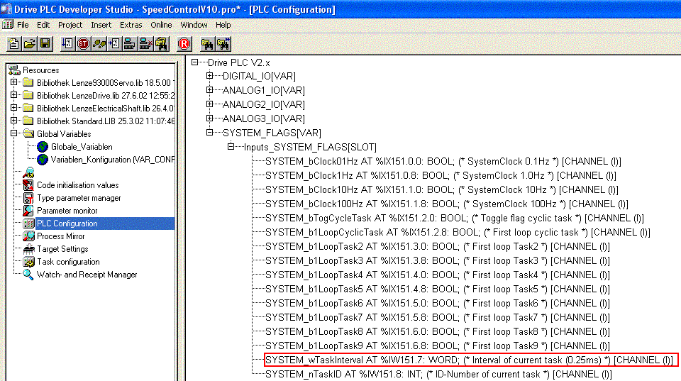 1. In the control configuration the system_flags are to be added (see screenshot DDS): SYSTEM_wTaskInterval AT %IW151.7: WORD; (*Interval of current task (0.25 ms) *) [CHANNEL (I)]