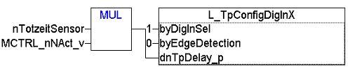 The function L_TpConfigDigInX is used to configure a dead time compensation from a POU of the PLC project. The compensation is provided in increments. Manufacturer specifications of time must be converted into a distance [inc] by multiplying with the current speed [inc/ms]. For this, the function  L_TpConfigDigInX and the calculation in a time-controlled task, preferably with short interval, must be called. The longer the intervals, the more inaccurate the localisation from the TP signal, since a speed change between the task requests is not considered.