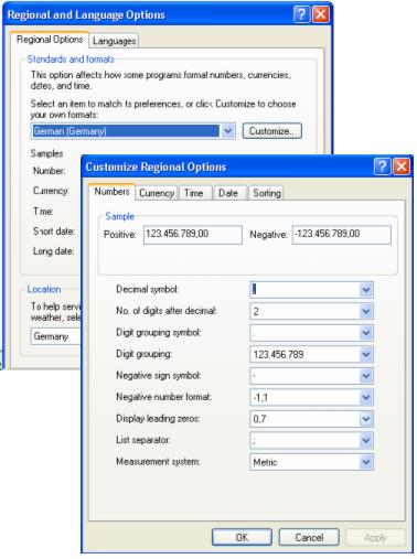 The cause can be that in case of Windows under Control panel / Regional and Language Options  a comma is not set in the preselection of the decimal separator. Enter a comma as decimal symbol (see figure below).