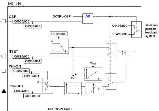 By means of the quickstop function the drive can be stopped  in a settable time independent from the setpoint selection (code C0105/000). The angle controller (position controller) is activated. If the rotor position is moved in spite of quickstop the drive will create a torque against this movement, when