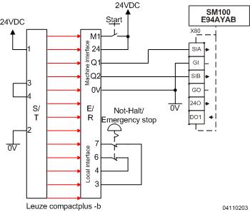 The light curtain is equipped with connections for an emergency stop switch, which is used here.