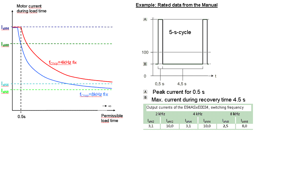 Example: A servo drive E94ASxE0034 has a rated current of IaN = 2.5 A and can be operated for a short time at 4-times overcurrent, i. e. IaM = 10 A. At a fixed switching frequency of fChop = 4 kHz, the inverter can be operated permanently with this overcurrent in the familiar 5-second cycle (0.5 seconds load with peak current and then 4.5 seconds recovery time with limited current). If the required peak current of IaM = 10 A and the cycle time remain the same, the inverter can only supply this peak current at a fixed switching frequency of fChop = 8 kHz for approximately 0.3 seconds.