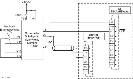 9400 with SM100 - Safe stop 1 with electronic safety relay - SM100 single-channel connection via shielded cable - performance level e