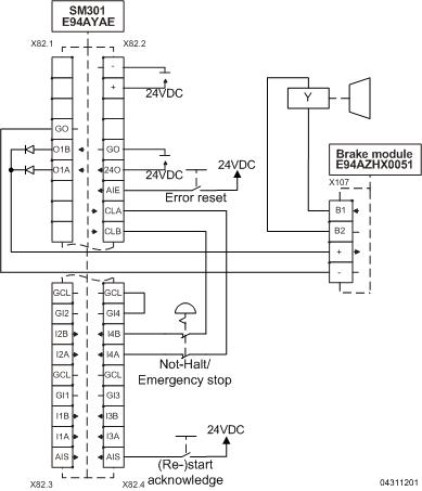 Function: When the safety function is requested, the motor is stopped according to stop category 1 of EN 60204-1. When the STO state is reached, the SM301 safely disconnects the brake module supply. To ensure that not only the brake is applied and the motor continues rotating when an error occurs in the SM301 which does not lead to STO, there is also an error set in the axis module. To exclude a short circuit between the decoupling diodes and X107 +, the cable must be protected.