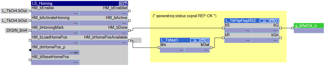 As a remedy you can use an FB interconnection which delays the status signal HM_bHomePosAvailable until homing has been completed (HM_bDone = FALSE=>TRUE). A corresponding example interconnection is described below.