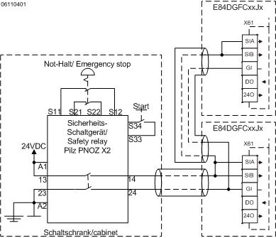 8400 motec with SO10 - Safe torque off at two controllers with electromechanical safety relay (PN-switching) - no fault exclusion for cable - performance level e