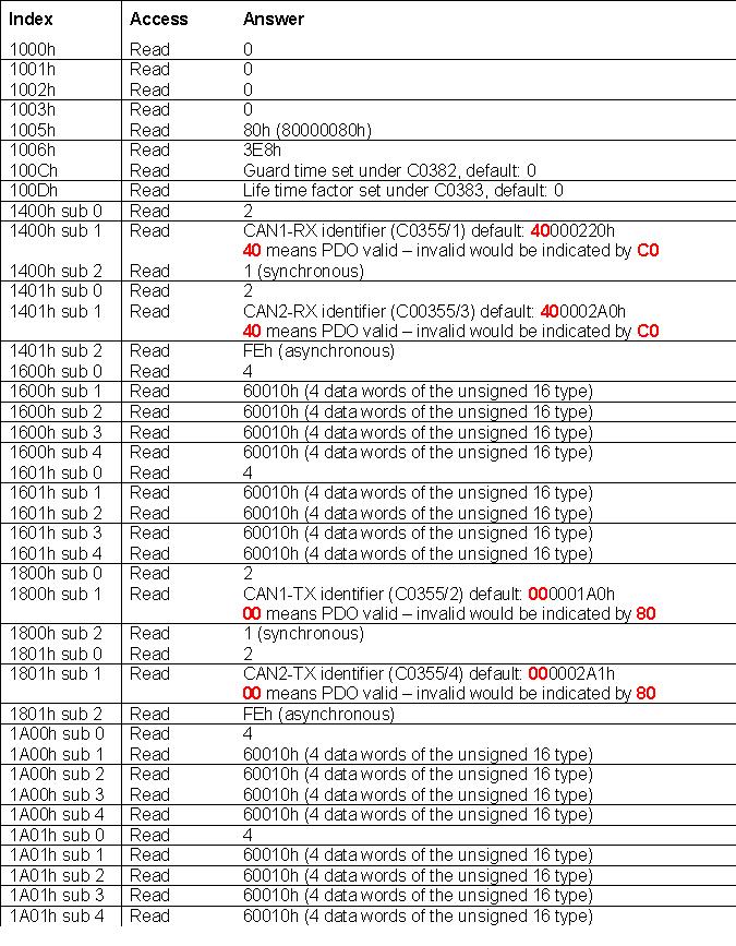 For the communication of the ECS power supply module with master control via CAN (like e.g. the CPC2000 by Lenze-Digitec) the CANopen objects with indices as of 1000h and higher need to be supported in order to ensure that the ECS power supply module connected to the CAN bus is detected.