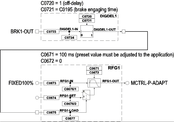 If these possibilities are not feasible because of inferior control properties, the configuration shown on the diagram should be selected. After brake closing time has elapsed (set in DIGDEL1) the influence of the angle controller is switched off via RFG1. The latter is only switched back on again at a ramp if the brake has disengaged. This can be at 100 ms by default but it must be adjusted to the application. With this configuration the following error is 'masked out', so to speak, for the time of torque feedforward control.