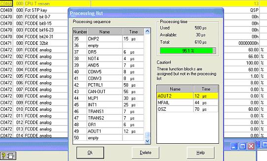 When transferring a parameter set, which has been created for a device with SW ≤ V2.1, to a device with SW > V2.1 the function blocks on the last positions of the processing list may not be transferred. In the present case the last function block in the processing list (AOUT2 on position 50; C0465/50 = 75) is not transferred. In the target system position 50 of the processing list is empty (C0465/50 = 0). A subsequent manual entry of the function block into the processing list is refused although according to the display of the 'Processing list' dialog the Global Drive Control has enough CPU time available.