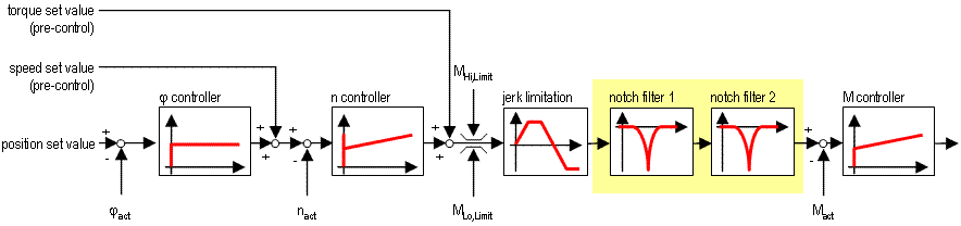 Unlike the 9300 and ECS servo controller series, the servo controllers of the 9400 series allow you to filter out fixed parasitic frequencies by using notch filters (current setpoint filters) and, as a result, to clearly optimise the connected control circuits (speed controller/position/phase controller) once again. How do the notch filters work and what must be observed when using notch filters?