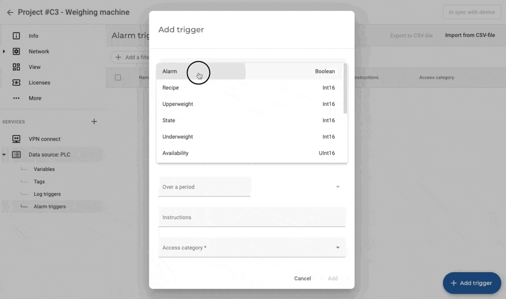 • Click on [data source] , [Alarm triggers], then click on [add trigger]