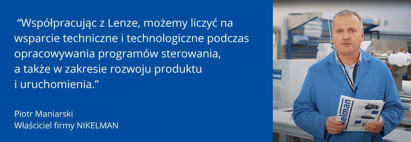 Sterownik Lenze 3200 C służy do sterowania maszyną i jest odpowiedzialny za logikę maszyny. Synchronizacja odbywa się bezpośrednio na serwonapędach i950 i i700 i jest realizowana za pośrednictwem sieci EtherCAT. Pozycja głównego cylindra jest przesyłana, a osiem jednostek drukujących jest precyzyjnie zsynchronizowanych. Bloki funkcyjne Lenze-FAST służą do programowania procesów maszyny, umożliwiając szybkie i precyzyjne pozycjonowanie wałków drukujących. Byliśmy w stanie znacznie skrócić czas projektowania i umożliwić szybką adaptację.