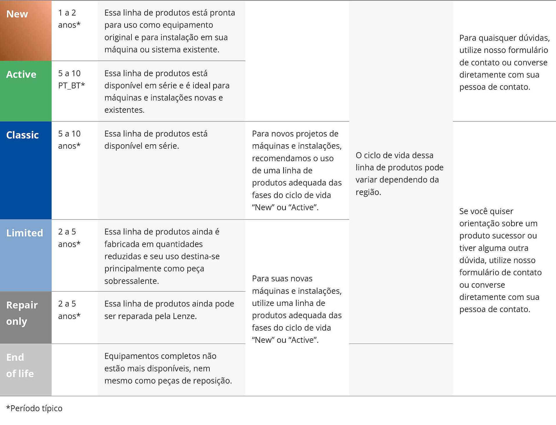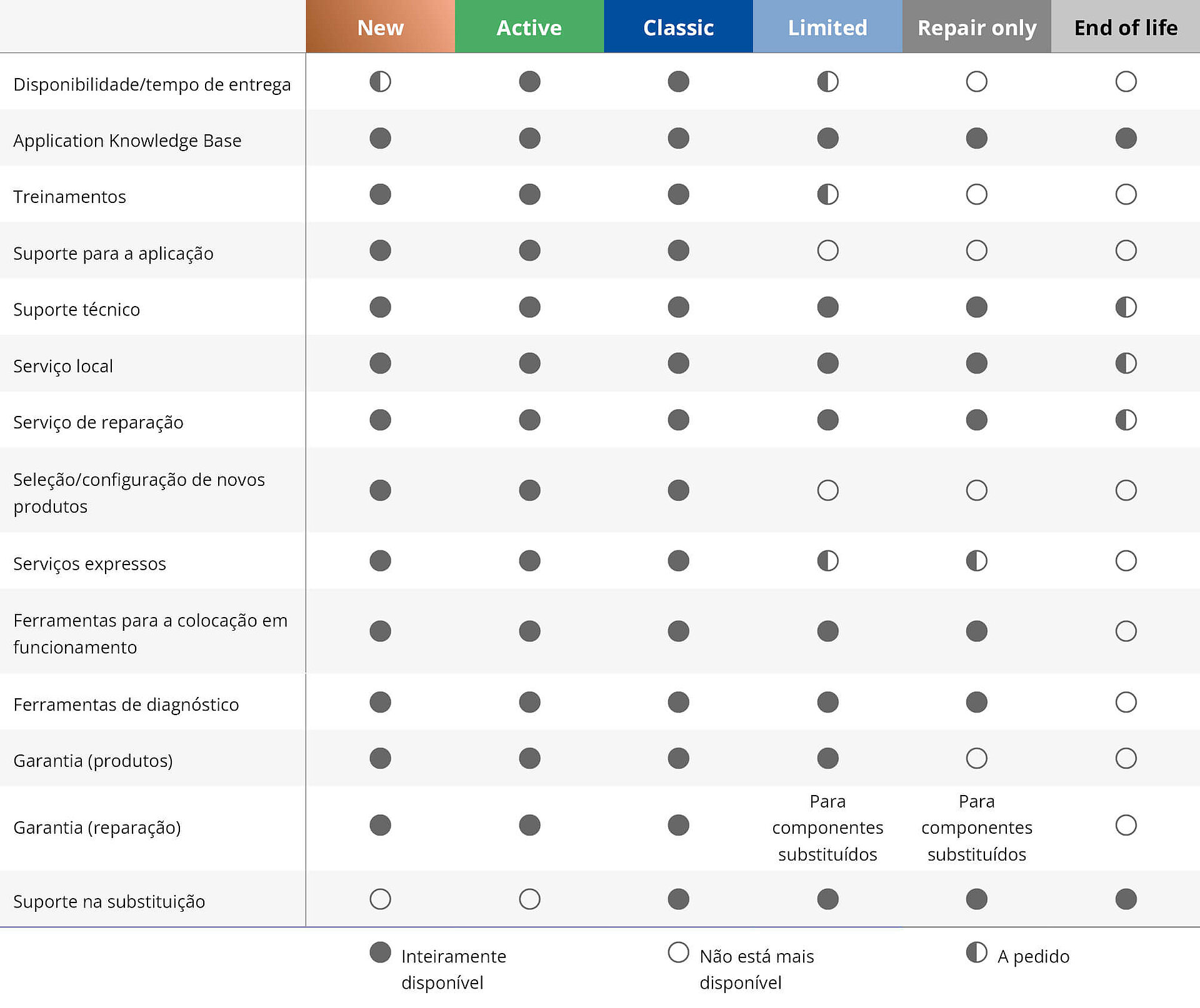 Durante o ciclo de vida, treinamentos, serviços e suporte ao produto estão disponíveis na abrangência conhecida. Em cada fase, há regras claras e informações atualizadas sobre o status do produto, sobre as quais informamos ativamente os clientes. Além disso, é apresentada a abrangência do suporte para uma transição estruturada para um produto sucessor.