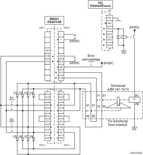 When the safety door is open, the switches S1 / S2 are actuated and the motor is operated in special operation mode with safely limited speed and safely limited direction in positive or negative direction.